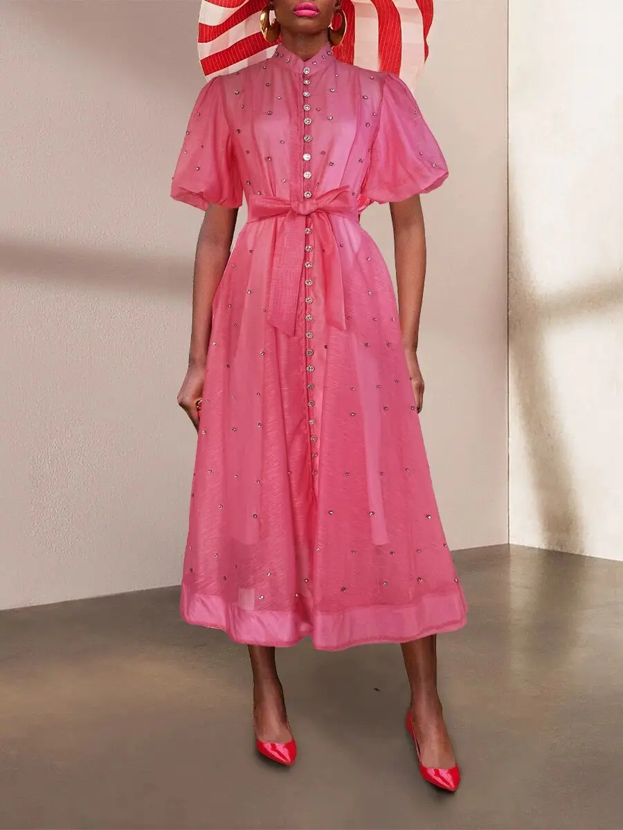 فستان فورمال بتصميم صيفي أنيق يتميز بأكمام قصيرة وصدر واحد مطرز بالكريستال، مثالي للحفلات والمناسبات ويجمع بين الأناقة والفخامة لإطلالة تترك انطباعًا لا يُنسى.